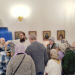 После экскурсии беседа продолжилась в цокольном этаже храма, где отец Стахий рассказал о церковном пении: истории появления, развитии византийского песнопения и русского церковного пения.